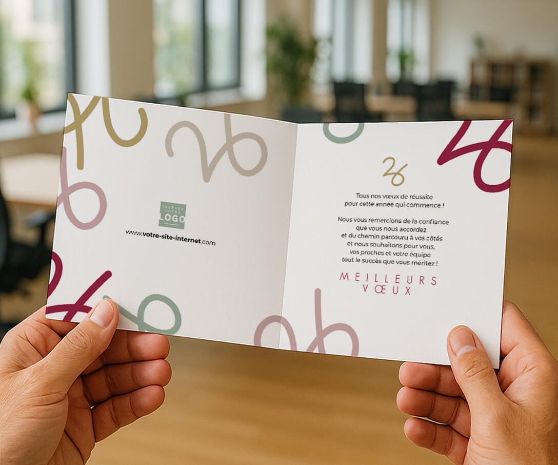 Chaque carte est un exemple de créativité. Nous proposons des formats et des designs originaux et uniques. Petit plus pour les cartes personnalisées : la mise en forme du texte est créative pour valoriser votre message et capter l'attention de vos partenaires et clients.